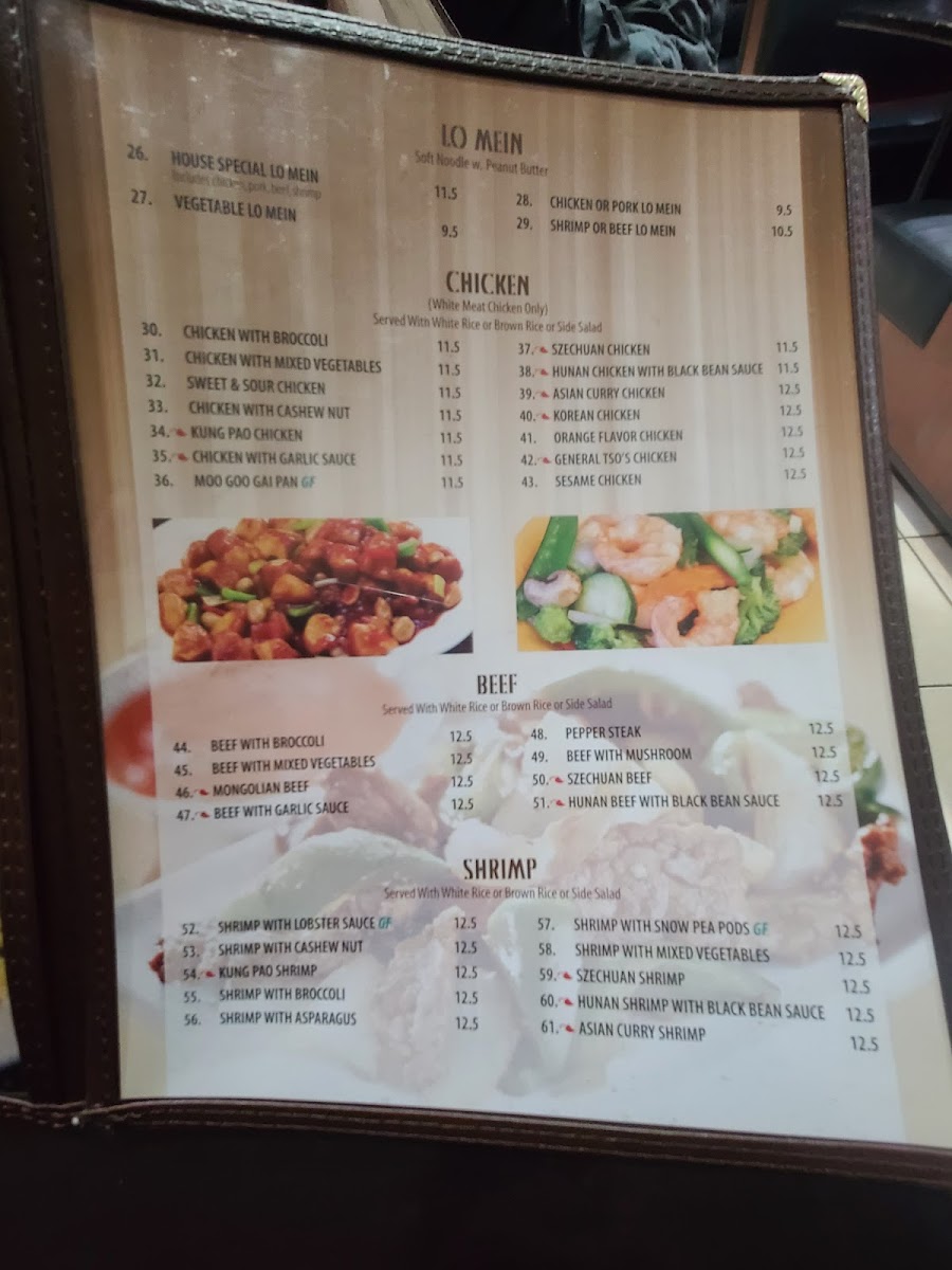 Shrimp with snow peas. Side: Crab Rangoon or Egg Roll. Rice: Brown, Fried, Lo Mein, or White.